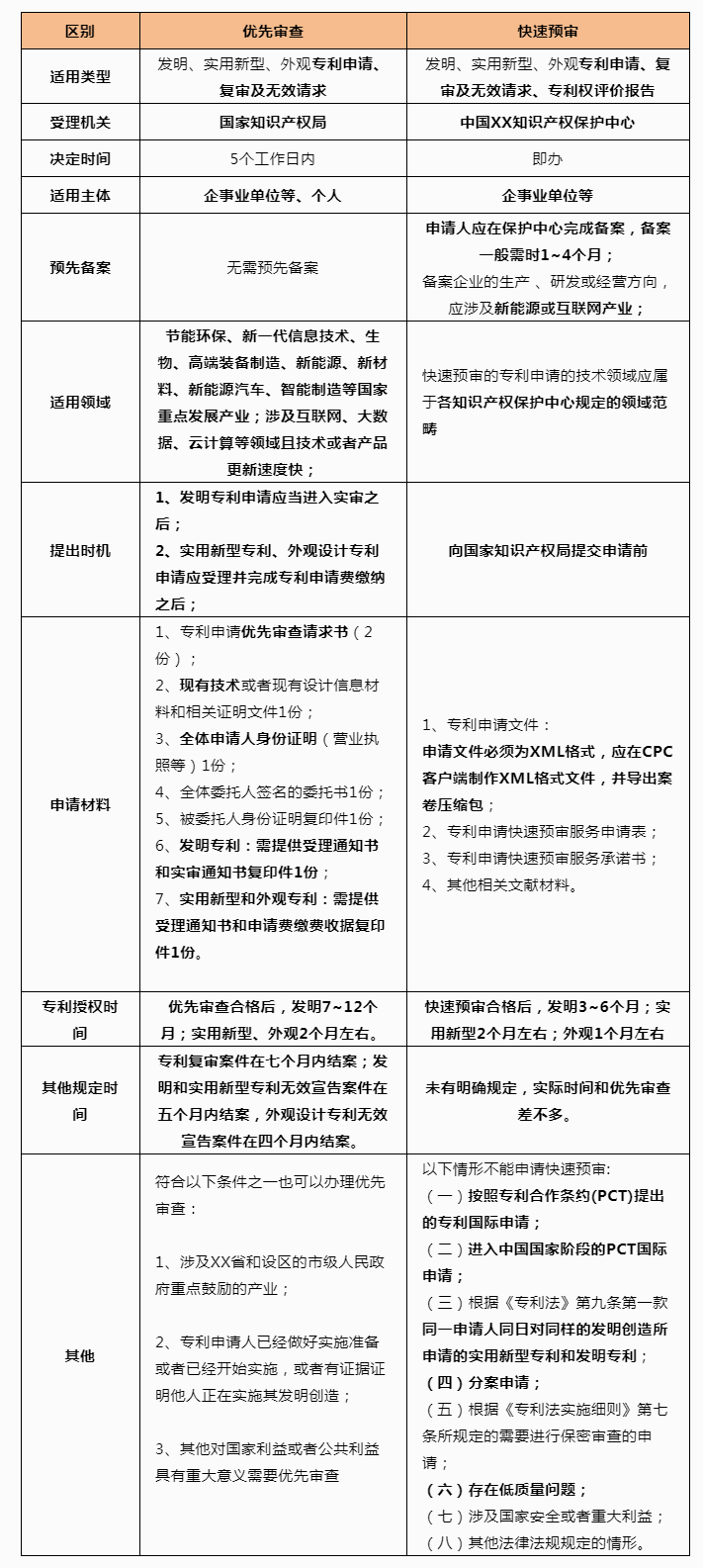 快速预审:是指各个地方的保护中心为符合相应产业要求的企业等提供专利申请预先审查服务,国家局对通过保护中心预审的专利申请进行加快审。